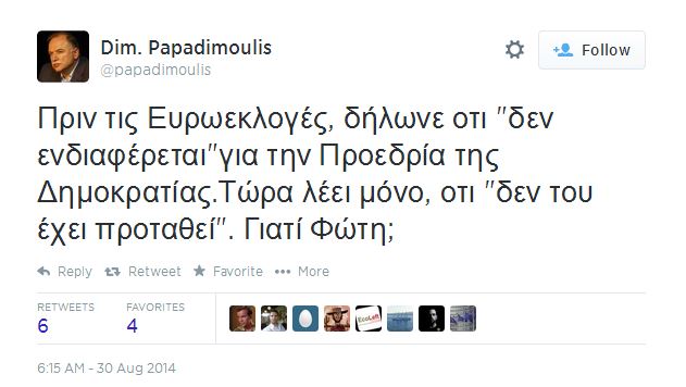 “Πριν τις Ευρωεκλογές, δήλωνε ότι “δεν ενδιαφέρεται”για την Προεδρία της Δημοκρατίας.Τώρα λέει μόνο, οτι “δεν του έχει προταθεί”. Γιατί Φώτη;” έγραψε ο ευρωβουλευτής του ΣΥΡΙΖΑ Δημήτρης Παπαδημούλης.
