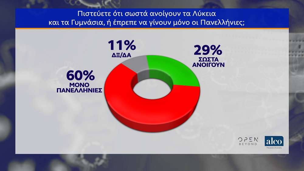Σε ερώτηση για το άνοιγμα των Λυκείων και των Γυμνασίων, το 60% υποστηρίζει ότι θα έπρεπε να γίνουν μόνο Πανελλήνιες εξετάσεις, το 29% υποστήριξε ότι σωστά ανοίγουν τα σχολεία αυτά και το 11% δεν ξέρει/δεν απαντά.