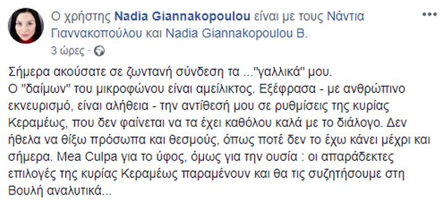 Λάθος της χαρακτήρισε τα «γαλλικά» της κατά της υπουργού Παιδείας, Νίκης Κεραμέως, στη Βουλή, η βουλευτής του Κινήματος Αλλαγής, Νάντια Γιαννακοπούλου, μέσω Facebook.