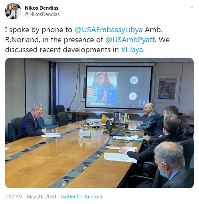 Η τηλεφωνική επικοινωνία του κ. Δένδια με τον κ. Νόρλαντ έγινε παρουσία του πρέσβη των ΗΠΑ στην Αθήνα Τζέφρι Πάιατ και στο επίκεντρο βρέθηκαν όλες οι πρόσφατες εξελίξεις στη Λιβύη.