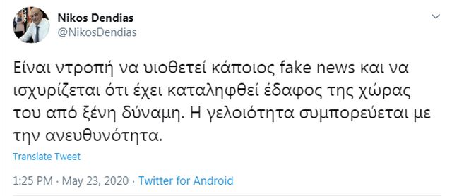 «Είναι ντροπή να υιοθετεί κάποιος fake news και να ισχυρίζεται ότι έχει καταληφθεί έδαφος της χώρας του από ξένη δύναμη. Η γελοιότητα συμπορεύεται με την ανευθυνότητα».