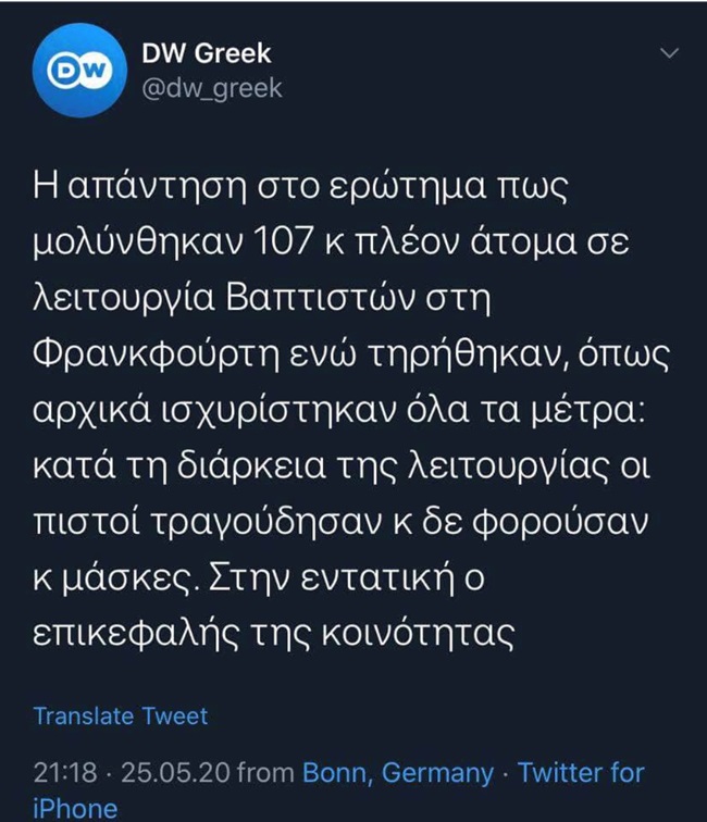 Το κείμενο αναφέρει πως «η απάντηση στο ερώτημα πώς μολύνθηκαν 107 και πλέον άτομα σε λειτουργία Βαπτιστών στην Φρανκφούρτη, ενώ τηρήθηκαν όπως αρχικά ισχυρίστηκαν όλα τα μέτρα: κατά την διάρκεια της λειτουργίας, οι πιστοί τραγούδησαν και δεν φορούσαν μάσκες. Στην εντατική ο επικεφαλής της κοινότητας».