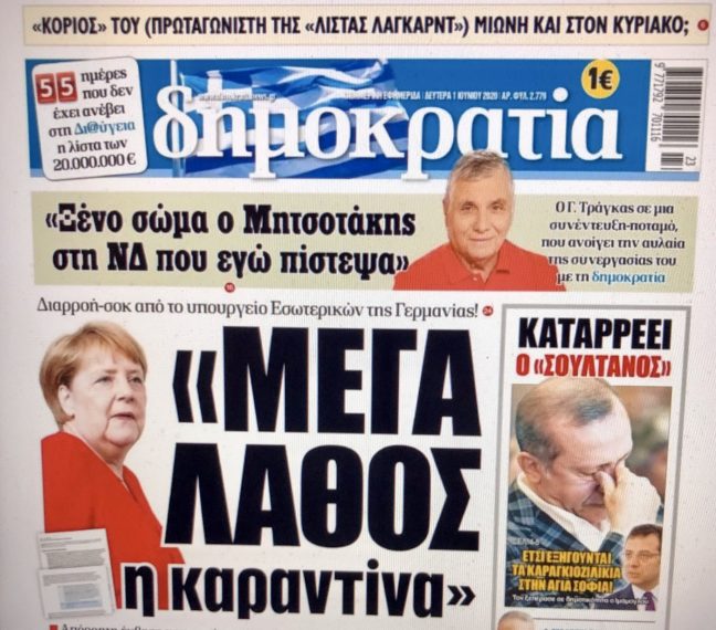 Δείτε και το πρωτοσέλιδο της εφημερίδας «Δημοκρατία» για το θέμα: