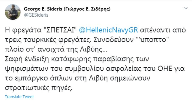 Όπως έγραψε στο Twitter ο στρατιωτικός συντάκτης της ΕΡΤ, Γιώργος Σιδέρης, «Η φρεγάτα “ΣΠΕΤΣΑΙ” του ελληνικού πολεμικού ναυτικού απέναντι από τρεις τουρκικές φρεγάτες.