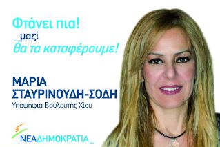 “Δεν σας κρύβω ότι από τη στιγμή που αποφάσισα να είμαι υποψήφια κάποιοι με πλησίασαν για να γίνω και εγώ μέρος του συστήματός τους και κάποιοι προσπάθησαν να με αποτρέψουν από την τελική μου απόφαση… Και τώρα που είμαι στην τελική ευθεία θέλουν με χίλιους τρόπους, να ανακόψουν την πορεία μου, ασκώντας κάθε είδους πίεση” δήλωνε η Μαρία Σταυρινούδη Σόδη, που τελικά δεν το έβαλε κάτω και κατάφερε, μετά από τόσο κόπο, να είναι πλέον εκπρόσωπος της Χίου στην Βουλή.