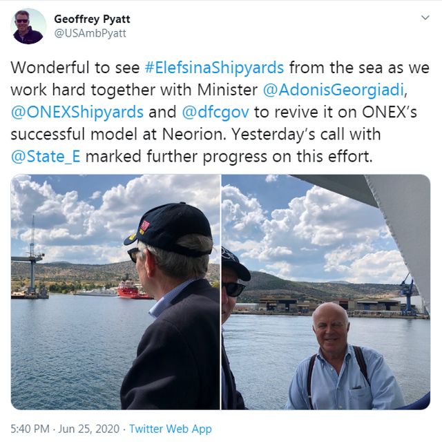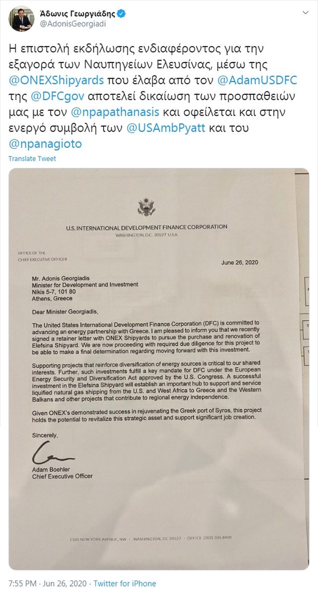 Ο υπουργός έδωσε στη δημοσιότητα και την επίσημη επιστολή εκδήλωσης ενδιαφέροντος, την οποία υπογράφει ο επικεφαλής της αμερικανικής υπηρεσίας χρηματοδότησης αναπτυξιακών έργων (DFC) Άνταμ Μπόλερ, ενώ ο κ. Γεωργιάδης σημειώνει ότι «η επιστολή εκδήλωσης ενδιαφέροντος για την εξαγορά των Ναυπηγείων Ελευσίνας, μέσω της ONEX Shipyards, αποτελεί δικαίωση των προσπαθειών μας με τον υφυπουργό Ανάπτυξης και Επενδύσεων Νίκο Παπαθανάση και οφείλεται και στην ενεργό συμβολή του Αμερικανού πρέσβη, Τζέφρι Πάιατ και του υπουργού Εθνικής Αμυνας Νίκου Παναγιωτόπουλου».