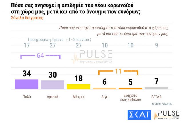 Στην ερώτηση πόσο σας ανησυχεί ο κορωνοϊός μετά το άνοιγμα των συνόρων το 34% απάντησε πολύ, το 30% αρκετά, το 18% μέτρια, ενώ το λίγο έως καθόλου συγκεντρώνει 11%.
