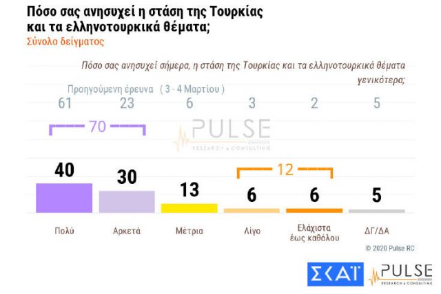 «Πόσο σας ανησυχεί η στάση της Τουρκίας;», ήταν το επόμενο ερώτημα με 40% να απαντάει πολύ, 30% αρκετά, 13% μέτρα, 12% λίγο έως ελάχιστα και καθόλου.
