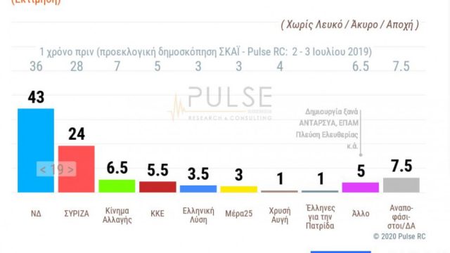 Νέα δημοσκόπηση της Pulse για τον ΣΚΑΪ με τη διαφορά της Νέας Δημοκρατίας με τον ΣΥΡΙΖΑ να βρίσκεται στις 18 μονάδες, από 19,5% στην προηγούμενη μέτρηση του Ιουνίου.