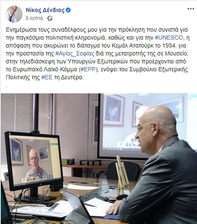 «Ενημέρωσα τους συναδέλφους μου για την πρόκληση που συνιστά για την παγκόσμια πολιτιστική κληρονομιά, καθώς και για την #UNESCO, η απόφαση που ακυρώνει το διάταγμα του Κεμάλ Ατατούρκ το 1934, για την προστασία της #Αγίας_Σοφίας διά της μετατροπής της σε Μουσείο, στην τηλεδιάσκεψη των Υπουργών Εξωτερικών που προέρχονται από το Ευρωπαϊκό Λαϊκό Κόμμα (#EPP), ενόψει του Συμβούλιο Εξωτερικής Πολιτικής της #ΕΕ τη Δευτέρα».