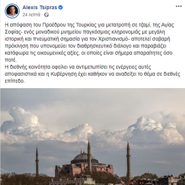 Ο Αλέξης Τσίπρας, με ανάρτησή του στο Facebook, καταδικάζει σθεναρά τη μετατροπή της Αγίας Σοφίας σε τζαμί από το ισλαμιστικό καθεστώς της Άγκυρας.