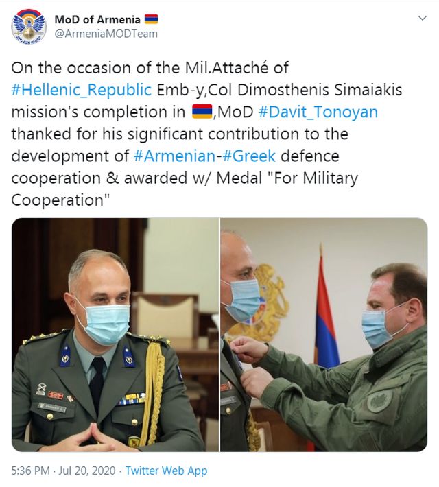 Ταυτόχρονα ο Υπουργός Άμυνας της Αρμενίας, ευχαρίστησε τον Στρατιωτικό Ακόλουθο Δημοσθένη Σιμαγιάκη, για τη συμβολή του στην ανάπτυξη της ελληνο-αρμενικής αμυντικής συνεργασίας κατά τη διάρκεια της θητείας του και του απένειμε το Μετάλλιο Στρατιωτικής Συνεργασίας .