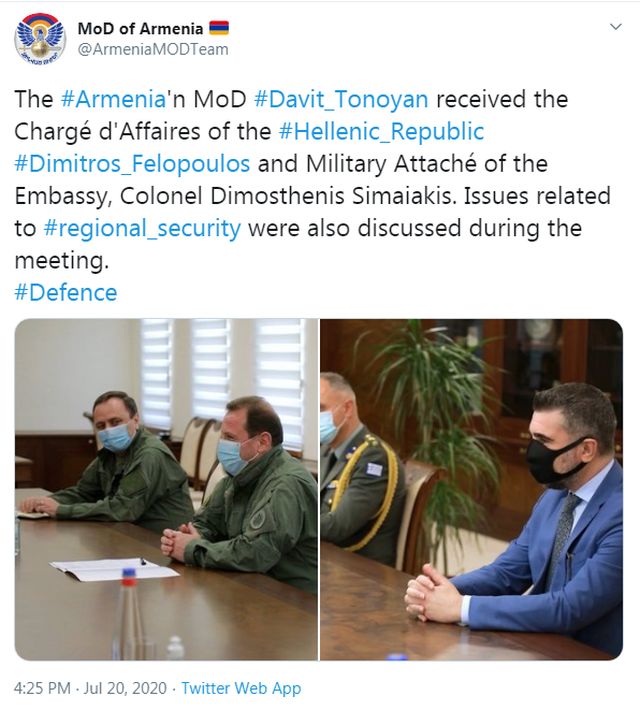 Επίσης ο Αρμένιος Υπουργός, παρουσίασε στην ελληνική αποστολή, την κατάσταση όπως διαμορφώνεται στη σύγκρουση με τους Αζέρους.