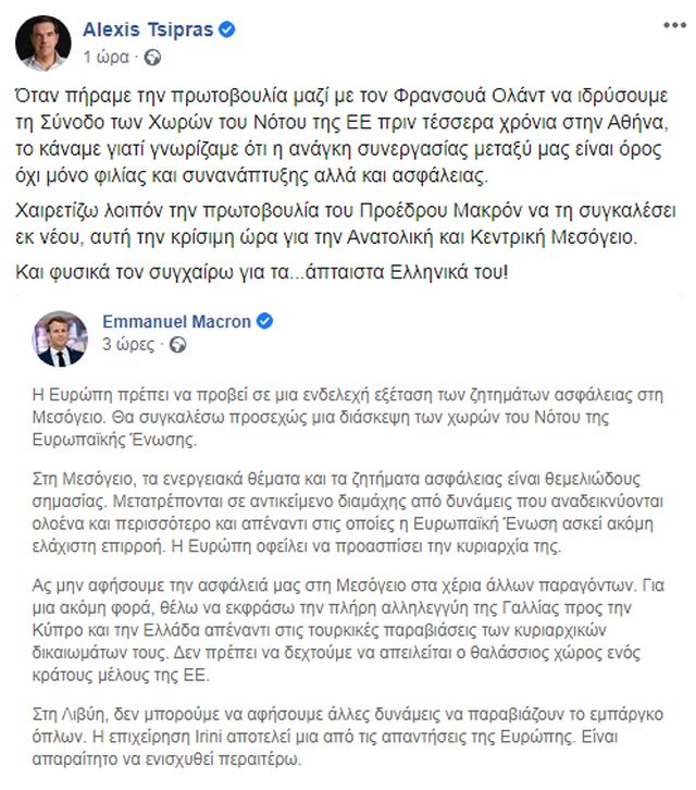 Στην ανάρτησή του ο κ. Τσίπρας έχει κοινοποιήσει τη σχετική ανάρτηση του Γάλλου Προέδρου που είναι γραμμένη στα ελληνικά, σχολιάζοντας: