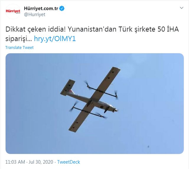 Μια τουρκική ιδιωτική εταιρεία κατασκευής δρόνων (ντρον) κέρδισε συμβόλαιο να πουλήσει 50 μικρά τακτικά ντρον στο ελληνικό υπουργείο Άμυνας, ανακοίνωσε η εταιρεία στις 28 Ιουλίου, μεταδίδουν οι ιστοσελίδες Defence News και Defence Arabic.