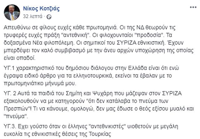 »ΥΓ. 2 Αυτά τα παιδιά του Σημίτη και Ψυχάρη που μάζεψαν στον ΣΥΡΙΖΑ εξακολουθούν να με κατηγορούν “ότι δεν κατάλαβα το πνεύμα των Πρεσπών”! Τι να κάνουμε, ομολογώ, δεν μας έδωσε ο θεός εξίσου μυαλό και “πνεύμα”.