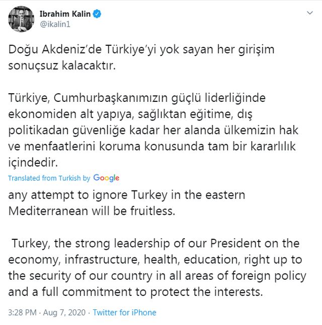 Εμφανής είναι ο εκνευρισμός της τουρκικής πλευράς μετά τη συμφωνία Ελλάδας-Αιγύπτου για τον τμηματικό καθορισμό ΑΟΖ, καθώς μετά τη νέα τουρκική Navtex και την έξοδο του «Ορούτς Ρέις» στη θάλασσα με προορισμό τη θαλάσσια περιοχή νότια του Καστελόριζου, ο εκπρόσωπος της τουρκικής προεδρίας, Ιμπραήμ Καλίν, με tweet στον προσωπικό του λογαριασμό σημείωσε ότι «κάθε απόπειρα να αγνοηθεί η Τουρκία στην Ανατολική Μεσόγειο θα μείνει άκαρπη».