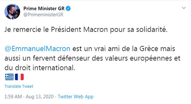 Μήνυμα στον Γάλλο πρόεδρο Εμανουέλ Μακρόν για την στήριξή του στο θέμα της τουρκικής προκλητικότητας στην Ανατολική Μεσόγειο έστειλε ο πρωθυπουργός Κυριάκος Μητσοτάκης με tweet στον επίσημο λογαριασμό του.