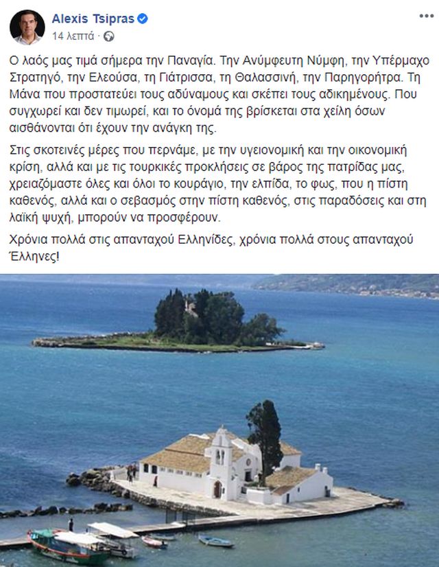 «Ο λαός μας τιμά σήμερα την Παναγία. Την Ανύμφευτη Nύμφη, την Υπέρμαχο Στρατηγό, την Ελεούσα, τη Γιάτρισσα, τη Θαλασσινή, την Παρηγορήτρα. Τη Μάνα που προστατεύει τους αδύναμους και σκέπει τους αδικημένους. Που συγχωρεί και δεν τιμωρεί, και το όνομά της βρίσκεται στα χείλη όσων αισθάνονται ότι έχουν την ανάγκη της», αναφέρει ο αρχηγός της αξιωματικής αντιπολίτευσης, Αλέξης Τσίπρας, σε μήνυμά του στο Facebook και συνεχίζει: