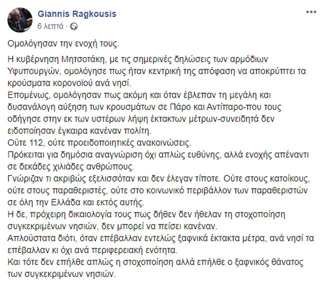 Ολομέτωπη επίθεση στην κυβέρνηση για την έκρηξη κρουσμάτων κορωνοϊού σε Πάρο και Αντίπαρο εξαπέλυσε ο Γιάννης Ραγκούσης με δύο αναρτήσεις του στο Facebook. Ο πρώην υπουργός και νυν βουλευτής του ΣΥΡΙΖΑ – Προοδευτική Συμμαχία, έγραψε νωρίτερα την Τρίτη: