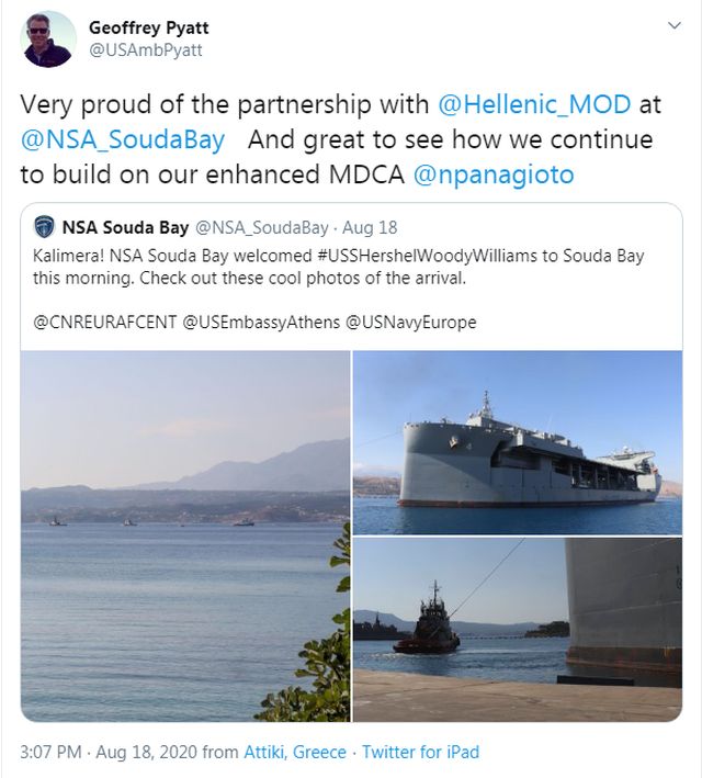 Το αμερικανικό πολεμικό πλοίο «Hershel Woody Williams» έφτασε στην Κρήτη με αποστολή να επιβλέπει την κατάσταση μεταξύ Ελλάδας και Τουρκίας, ύστερα από την ένταση που δημιουργήθηκε ανάμεσα στις δύο συμμαχικές στο πλαίσιο του ΝΑΤΟ χώρες σχετικά με τα δικαιώματα εκμετάλλευσης των ενεργειακών αποθεμάτων στην Ανατ. Μεσόγειο.