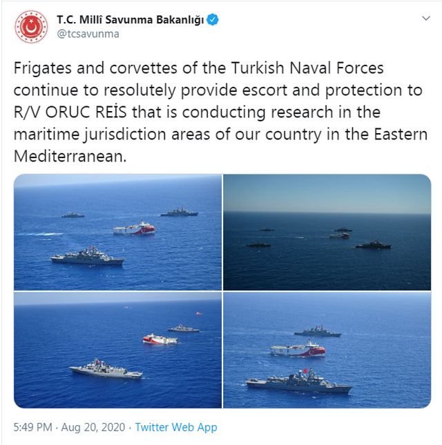 Μάλιστα στο twitter του τουρκικού υπουργείου Άμυνας, φαίνεται η λαβωμένη «Κεμάλ» να βρίσκεται στη Μεσόγειο συνοδεύοντας το ερευνητικό «Όρουτς Ρέις», μεταδίδει το Hellas Journal.