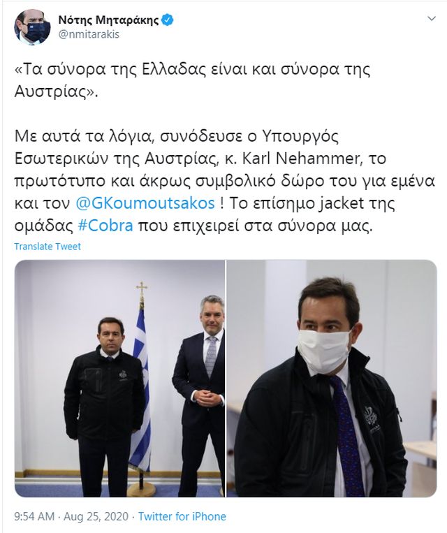 «Ένα δώρο που αντανακλά την υψηλή σημασία που δίνει η Αυστρία στην προστασία των εξωτερικών συνόρων της ΕΕ», έγραψε ο κ. Μηταράκης στην ανάρτησή του.
