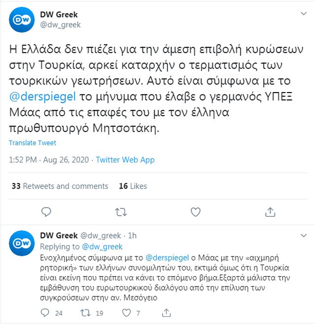 Η ελληνική υπηρεσία της Deutsche Welle, με ανάρτησή της στο Twitter, αναπαράγει το Der Spiegel που υποστηρίζει ότι, «Η Ελλάδα δεν πιέζει για την άμεση επιβολή κυρώσεων στην Τουρκία, αρκεί καταρχήν ο τερματισμός των τουρκικών γεωτρήσεων.