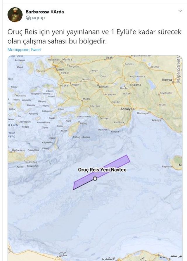 Το «Oruc Reis» παραμένει στη νοτιοανατολική Μεσόγειο μέχρι την 1η Σεπτεμβρίου. Η Τουρκία κλιμακώνει την προκλητικότητά της στη θαλάσσια περιοχή νότια Ρόδου-Καστελλόριζου και νοτιοανατολικά της Κρήτης, δηλαδή στο νοτιοανατολικό Νότιο Κρητικό Πέλαγος (η ίδια περιοχή ονομάζεται και Λύκιο Πέλαγος), με νέες συντεταγμένες ακριβώς πάνω από τα υποθαλάσσια πλούσια κοιτάσματα, εντός της ελληνικής υφαλοκρηπίδας – ΑΟΖ.