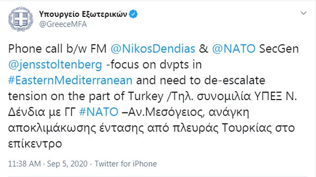 Στο μεταξύ αποκαλύφθηκε ο διάλογος που είχε ο υπουργός Άμυνας Νίκος Παναγιωτόπουλος με τον ΓΓ του ΝΑΤΟ σε συνάντησή τους στο Βερολίνο και στην οποία ο Έλληνας υπουργός είχε ξεκαθαρίσει ότι πρέπει να αποσυρθούν όλα τα τουρκικά πολεμικά πλοία.
