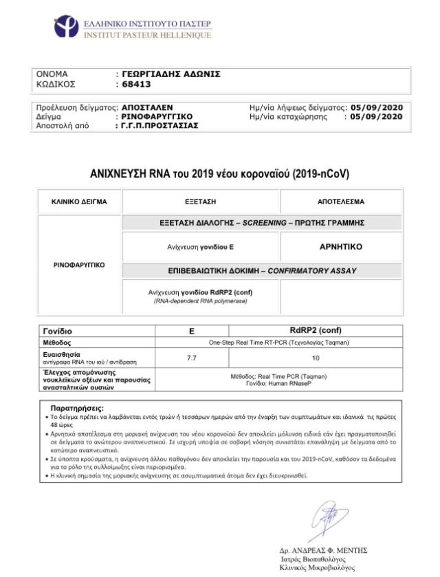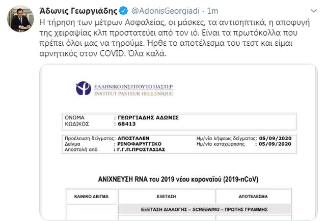 Ο Άδωνις Γεωργιάδης ανάρτησε στο Twitter το αποτέλεσμα του τεστ που έκανε για τον κορωνοϊό. Το αποτέλεσμα είναι αρνητικό.