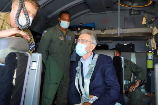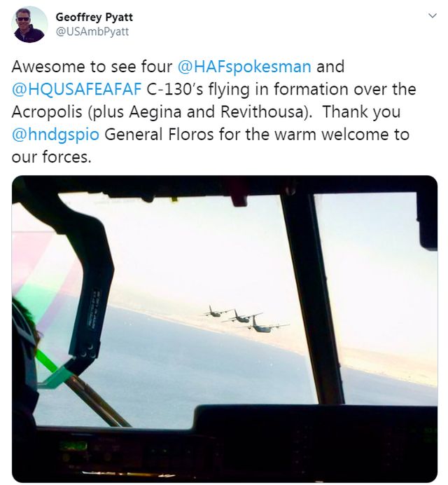 Ο Αρχηγός ΓΕΕΘΑ και ο Πρέσβης των ΗΠΑ επιβιβάστηκαν σε Α/Φ C–130J της Αεροπορίας των ΗΠΑ, το οποίο συμμετείχε σε σχηματισμό αποτελούμενο από άλλα δύο Αμερικανικά αεροσκάφη ιδίου τύπου και ένα Ελληνικό C-130H, που πραγματοποίησαν μεταξύ άλλων και χαμηλή διέλευση άνωθεν του λεκανοπεδίου Αττικής.