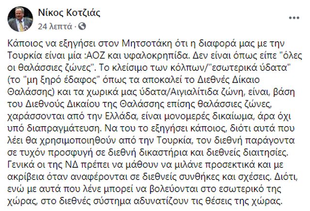 Αυστηρή προειδοποίηση στον πρωθυπουργό Κυριάκο Μητσοτάκη και στους υπόλοιπους κυβερνητικούς να προσέχουν κάθε λέξη που λένε αναφορικά με τα εθνικά μας θέματα, διότι οι λαθεμένες διατυπώσεις θα χρησιμοποιηθούν από την Τουρκία και τον διεθνή παράγοντα σε τυχόν προσφυγή στα διεθνή δικαστήρια, απηύθυνε ο Νίκος Κοτζιάς με ανάρτησή του στο Facebook:
