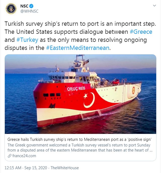 »Οι Ηνωμένες Πολιτείες υποστηρίζουν τον διάλογο μεταξύ Ελλάδας και Τουρκίας ως το μόνο μέσο επίλυσης των τρεχουσών διαφωνιών στην Ανατολική Μεσόγειο».