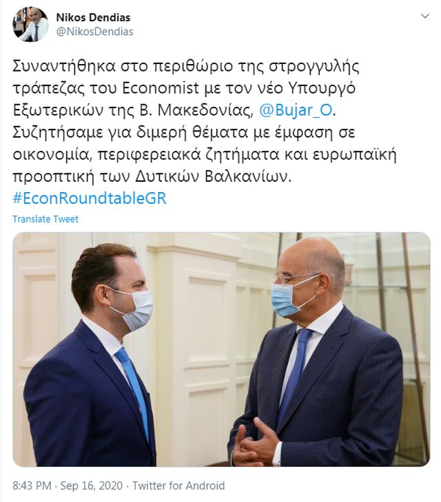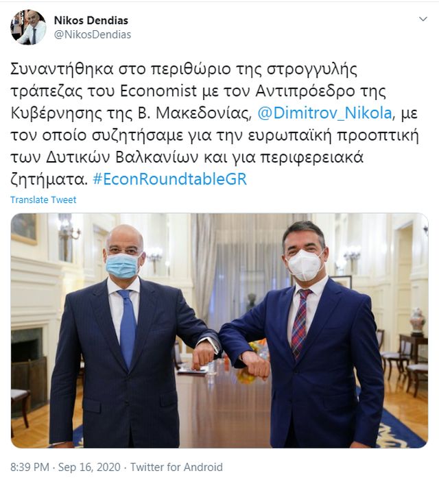 O υπουργός Εξωτερικών Νίκος Δένδιας συναντήθηκε την Τετάρτη, στο περιθώριο της Στρογγυλής Τραπέζης που διοργανώνει ο «Economist», με τον αντιπρόεδρο της Κυβέρνησης της Βόρειας Μακεδονίας αρμόδιο για τα ευρωπαϊκά θέματα, Νίκολα Ντιμιτρόφ, καθώς και με τον υπουργό Εξωτερικών της Βόρειας Μακεδονίας, Μπουγιάρ Οσμάνι.