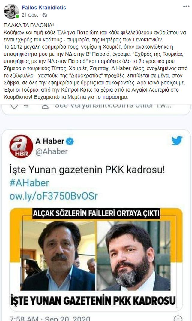 »”Εχθρός της Τουρκίας υποψήφιος με την ΝΔ στον Πειραιά” και παράθεσε όλο το βιογραφικό μου.