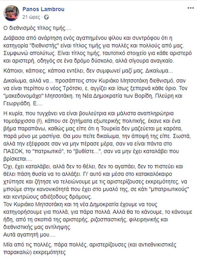 Επίθεση στο πατριωτικό ΠΑΣΟΚ, που βρίσκεται στον ΣΥΡΙΖΑ, εξαπέλυσε ο γνωστός Πάνος Λάμπρου, των δικαιωματιστών και των διεθνιστών και των διαδηλώσεων έξω από την πρεσβεία του Ισραήλ, κι άλλων σχετικών δράσεων, με ανάρτησή του στο Facebook.