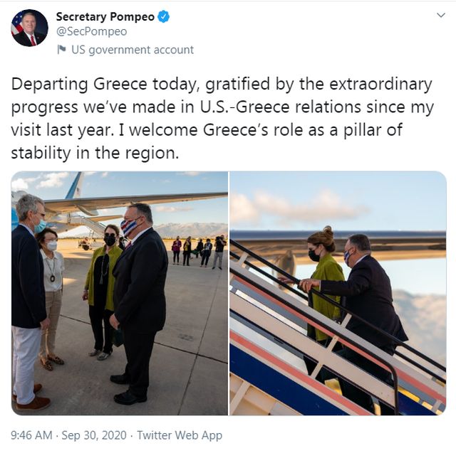 Τον ρόλο της Ελλάδας ως «πυλώνα σταθερότητας στην περιοχή» επανέλαβε σε ανάρτησή του ο Αμερικανός πρόεδρος Μάικ Πομπέο σε ανάρτησή του στο Twitter, επισημαίνοντας παράλληλα τη σημαντική πρόοδο που έχουν καταγράψει οι ελληνοαμερικανικές σχέσεις συγκριτικά με την περσινή επίσκεψή του.