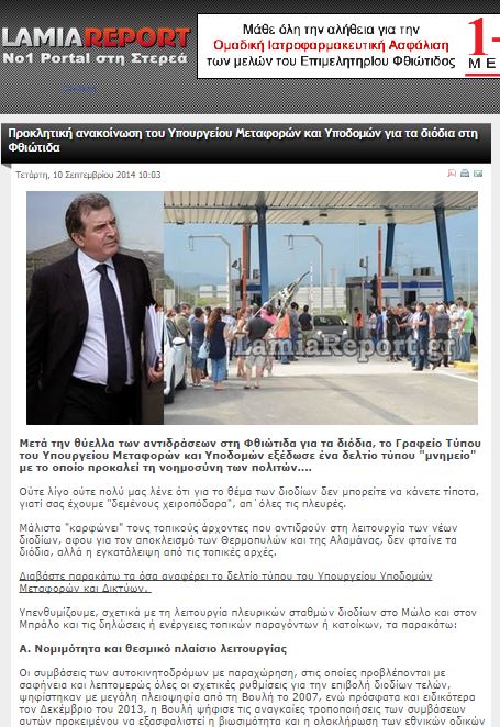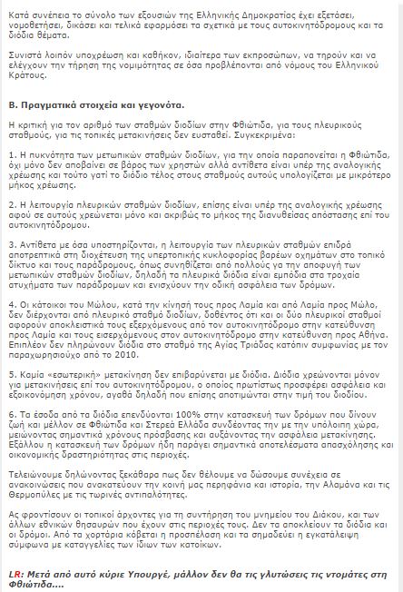 Μάλιστα “καρφώνει” τους τοπικούς άρχοντες που αντιδρούν στη λειτουργία των νέων διοδίων, αφου για τον αποκλεισμό των Θερμοπυλών και της Αλαμάνας, δεν φταίνε τα διόδια, αλλά η εγκατάλειψη από τις τοπικές αρχές.