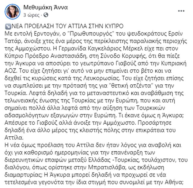 Τη διαφωνία της σε διερευνητικές με την Τουρκία στην παρούσα φάση, μετά την προσάρτηση ενός ακόμα μέρους της Αμμοχώστου στον Αττίλα, εξέφρασε με ανάρτησή της στο Facebook η περιφερειακή σύμβουλος Ατικής, Άννα Μεθυμάκη. «Η Άγκυρα μπορεί δηλαδή να προχωρεί σε νέα τετελεσμένα γεγονότα την ίδια στιγμή που συνομιλεί με την Αθήνα;», θέτει ρητορικά η περιφερειακή σύμβουλος.