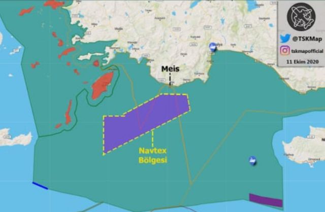 Tο Oruc Reis θα διεξάγει σεισμικές έρευνες από τις 12 Οκτωβρίου ώρα 6:00 UTC έως και τις 22 Οκτωβρίου, ώρα 20:59 UTC νότια του Καστελλόριζου.