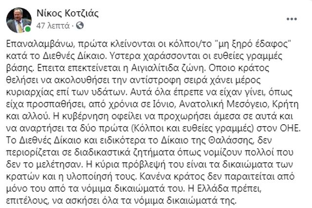 Ο Νίκος Κοτζιάς, με ανάρτησή του στο Facebook, συμβουλεύει δημοσίως πώς πρέπει να γίνει η επέκταση έως τα 12 ν.μ., για να μην έχουμε επώδυνες αστοχίες. Ο πρώην υπουργός Εξωτερικών έγραψε: