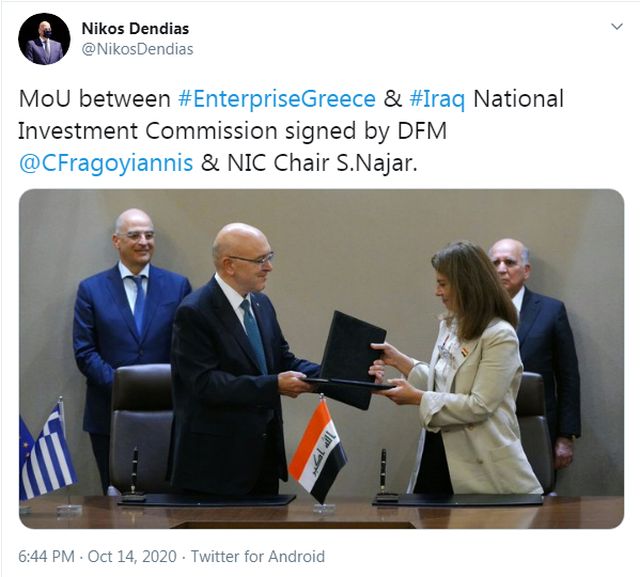 Οικονομική συμφωνία ανάμεσα στο Enterprise Greece και το National Investment Commission (NIC) του Ιράκ, με στόχο την ενδυνάμωση των επιχειρηματικών και οικονομικών σχέσεων των δύο χωρών υπέγραψαν ο υφυπουργός Εξωτερικών για την Οικονομική Διπλωματία, Κώστας Φραγκογιάννης, με την πρόεδρο του NIC Σούχα αλ Νατζάρ (Suha Al-Najjar).