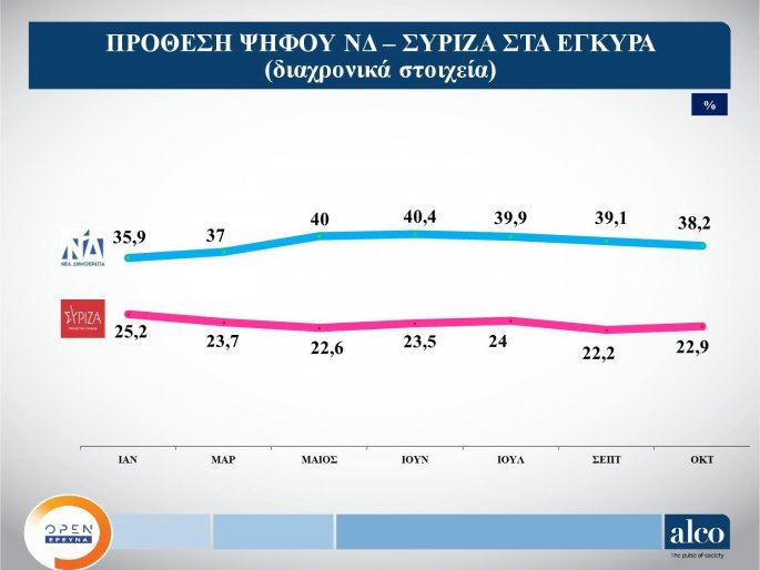 Μειώνεται η διαφορά ανάμεσα σε ΝΔ και ΣΥΡΙΖΑ σύμφωνα με την τελευταία δημοσκόπηση της Alco που παρουσίασε το τηλεοπτικό κανάλι Open.