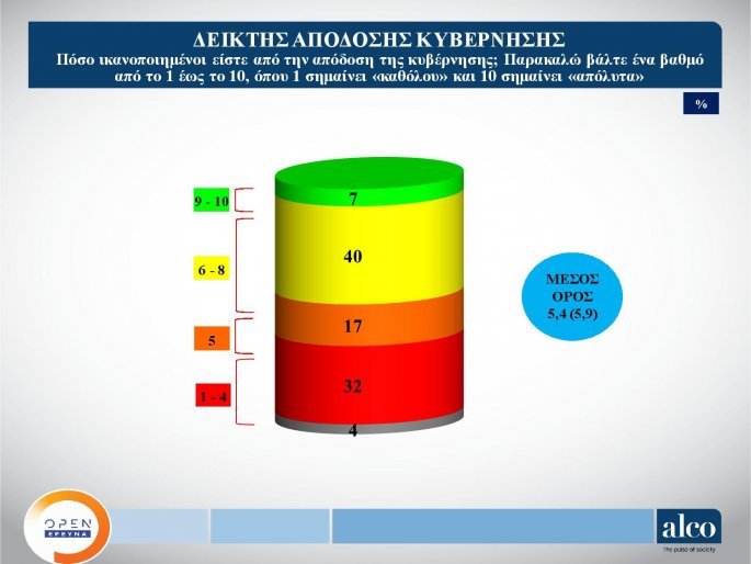Στην ίδια έρευνα, βαθμολογώντας την κυβέρνηση οι συμμετέχοντες έδωσαν 5,4 με άριστα το 10 από 5,9 που είχαν την είχαν βαθμολογήσει την προηγούμενη φορά.