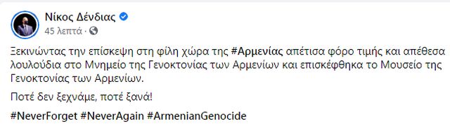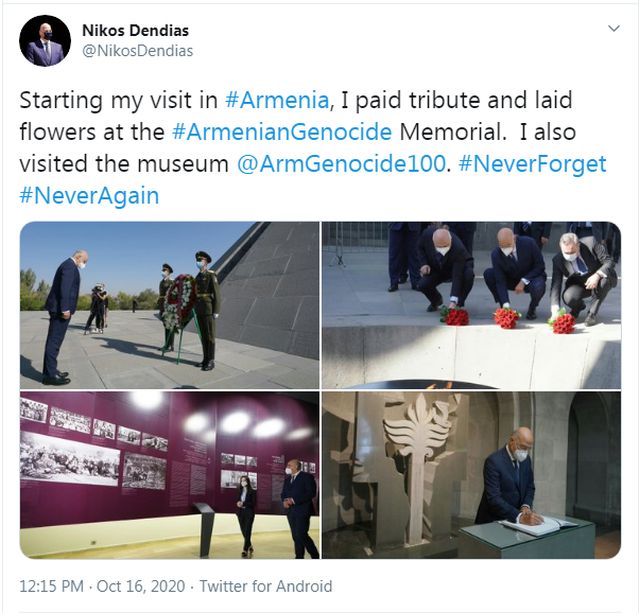 «Ξεκινώντας την επίσκεψη στη φίλη χώρα της #Αρμενίας απέτισα φόρο τιμής και απέθεσα λουλούδια στο Μνημείο της Γενοκτονίας των Αρμενίων και επισκέφθηκα το Μουσείο της Γενοκτονίας των Αρμενίων.