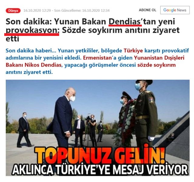 «Ο Έλληνας υπουργός Εξωτερικών Νίκος Δένδιας, που πήγε στην Αρμενία, επισκέφθηκε το λεγόμενο μνημείο της γενοκτονίας πριν τις συναντήσεις του», επισημαίνει.