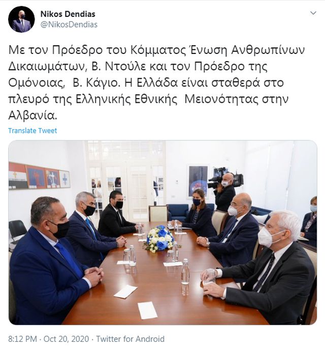 «Η Ελλάδα είναι σταθερά στο πλευρό της ελληνικής εθνικής μειονότητας στην Αλβανία» ήταν το μήνυμα του Έλληνα υπουργού Εξωτερικών Νίκου Δένδια στη συνάντηση που είχε στην Αλβανία με τους προέδρους του Κόμματος Ένωση Ανθρωπίνων Δικαιωμάτων, Βαγγέλη Ντούλε και της Ομόνοιας, Βασίλη Κάγιο.