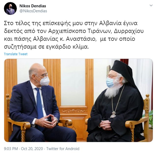 Ο υπουργός Εξωτερικών Νίκος Δένδιας ολοκλήρωσε την επίσκεψή του στα Τίρανα, με τις συναντήσεις του με τον Αρχιεπίσκοπο Τιράνων, Δυρραχίου και πάσης Αλβανίας Αναστάσιο, η οποία πραγματοποιήθηκε σε εγκάρδιο κλίμα, και μέλη της ελληνικής επιχειρηματικής κοινότητας στην Αλβανία.