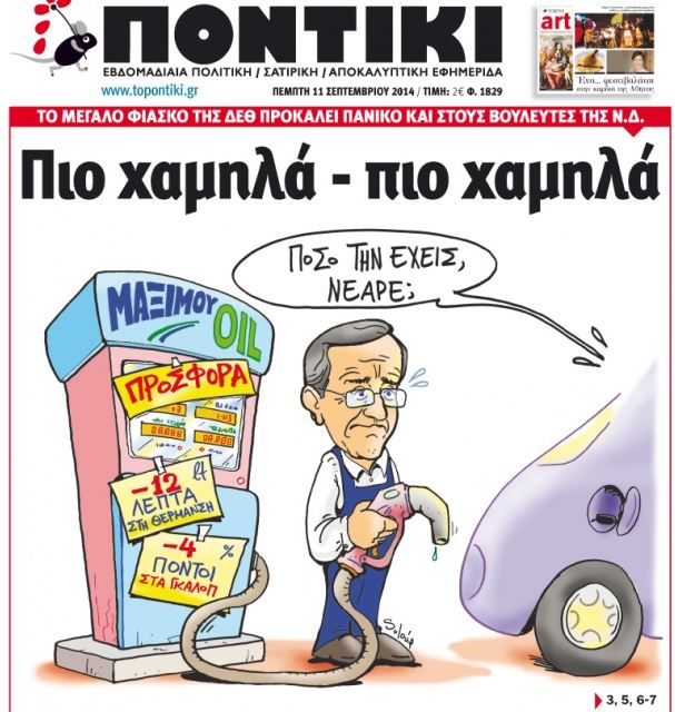Στην γελοιογραφία της πρώτης σελίδας, φαίνεται ο Πρωθυπουργός ως υπάλληλος βενζινάδικου που το έχει η εταιρεία “Μαξίμου όιλ”.